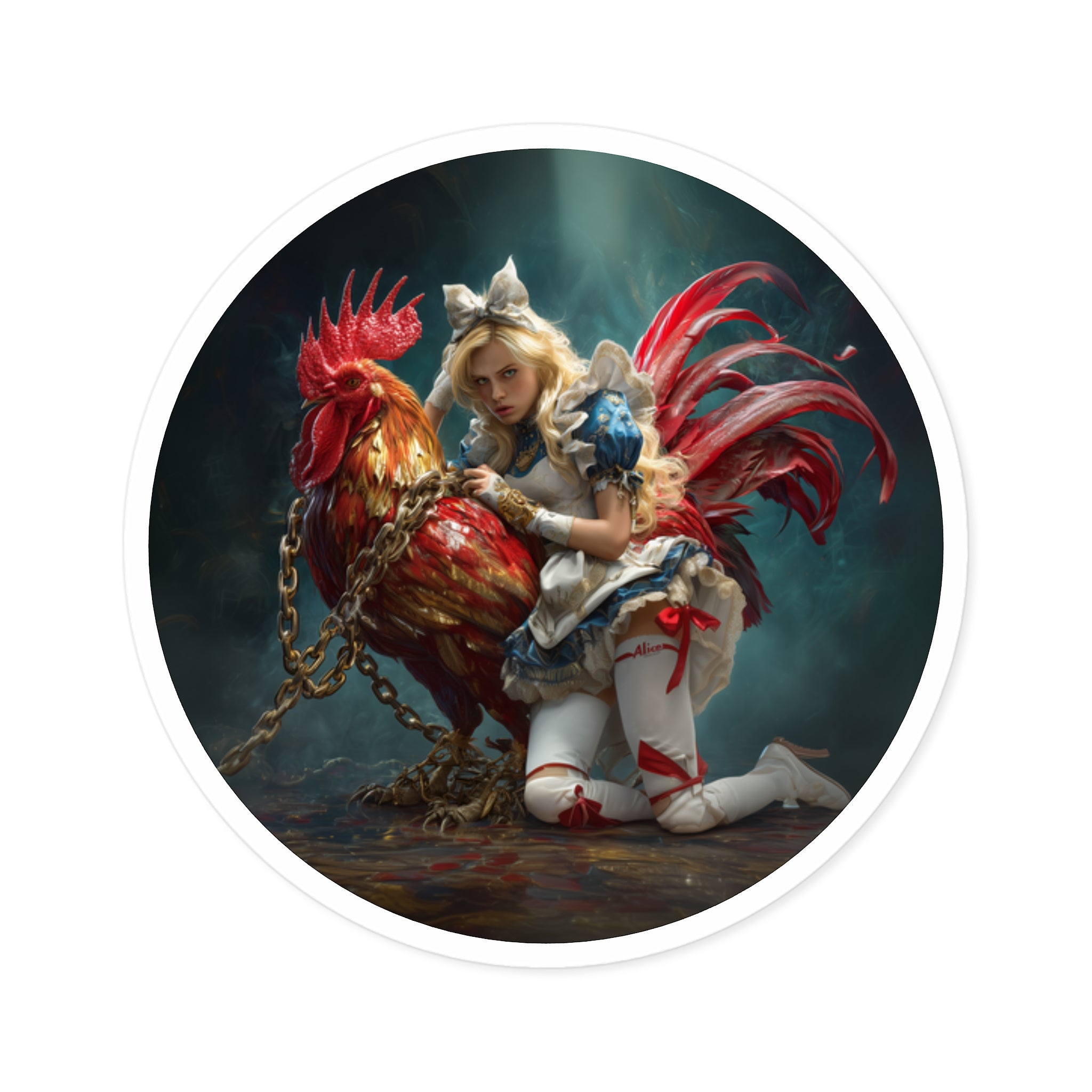 A bold and imaginative fantasy scene of Alice with a giant rooster — a whimsical mix of wonder and surreal charm.Product Features:-Material: Premium Vinyl-Available in...