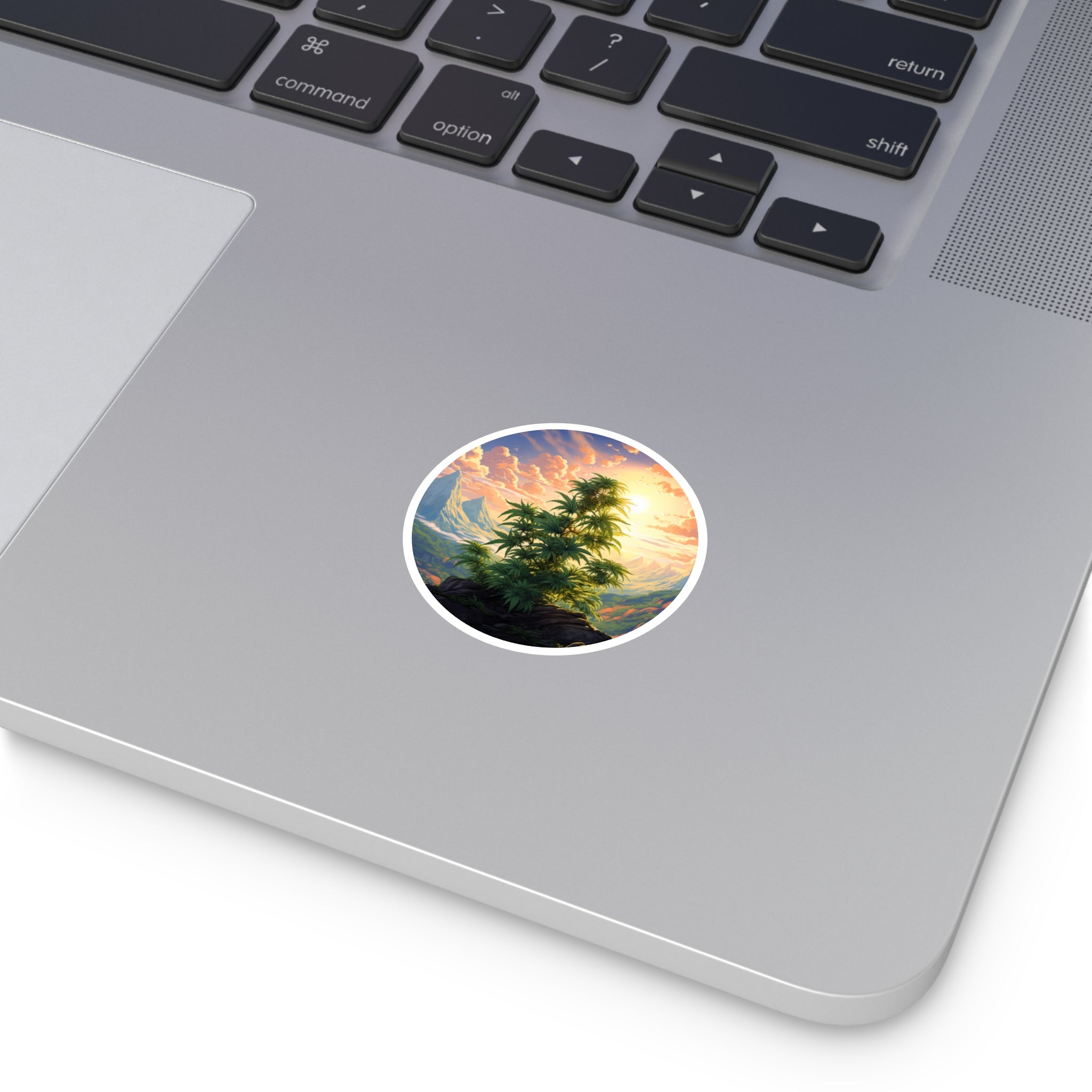 Cannabis Plant in Mountain Valley, Scenic Nature Sticker, Outdoor Art, Vibrant Design