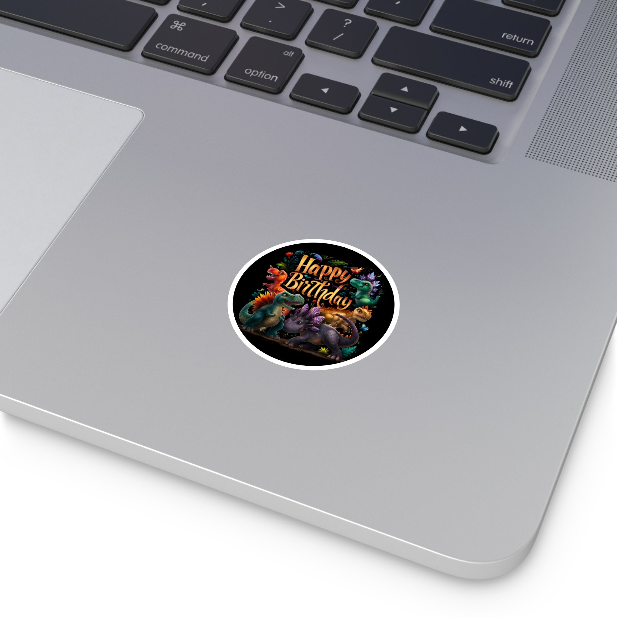A group of colorful dinosaurs celebrating with a big Happy Birthday sign — perfect for party decor and cheerful gifts.Product Features:-Material: Premium Vinyl-Available in 5...