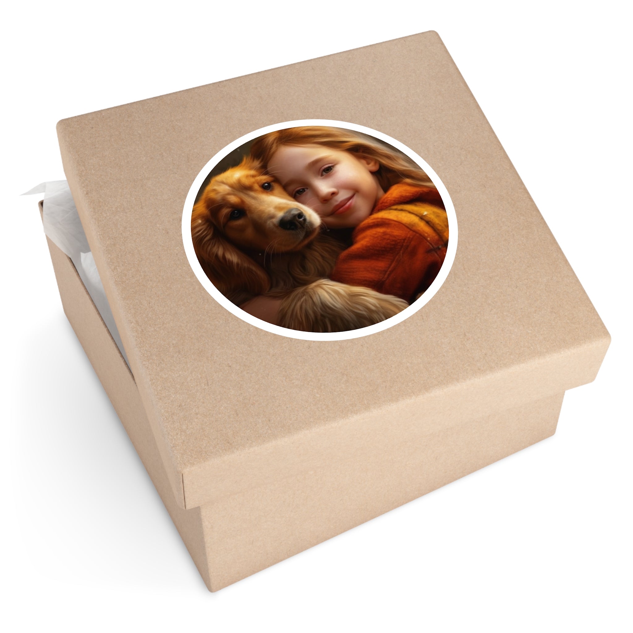 Golden Retriever Hug Sticker, Cozy Art Design, Tender Moment, Pet Love