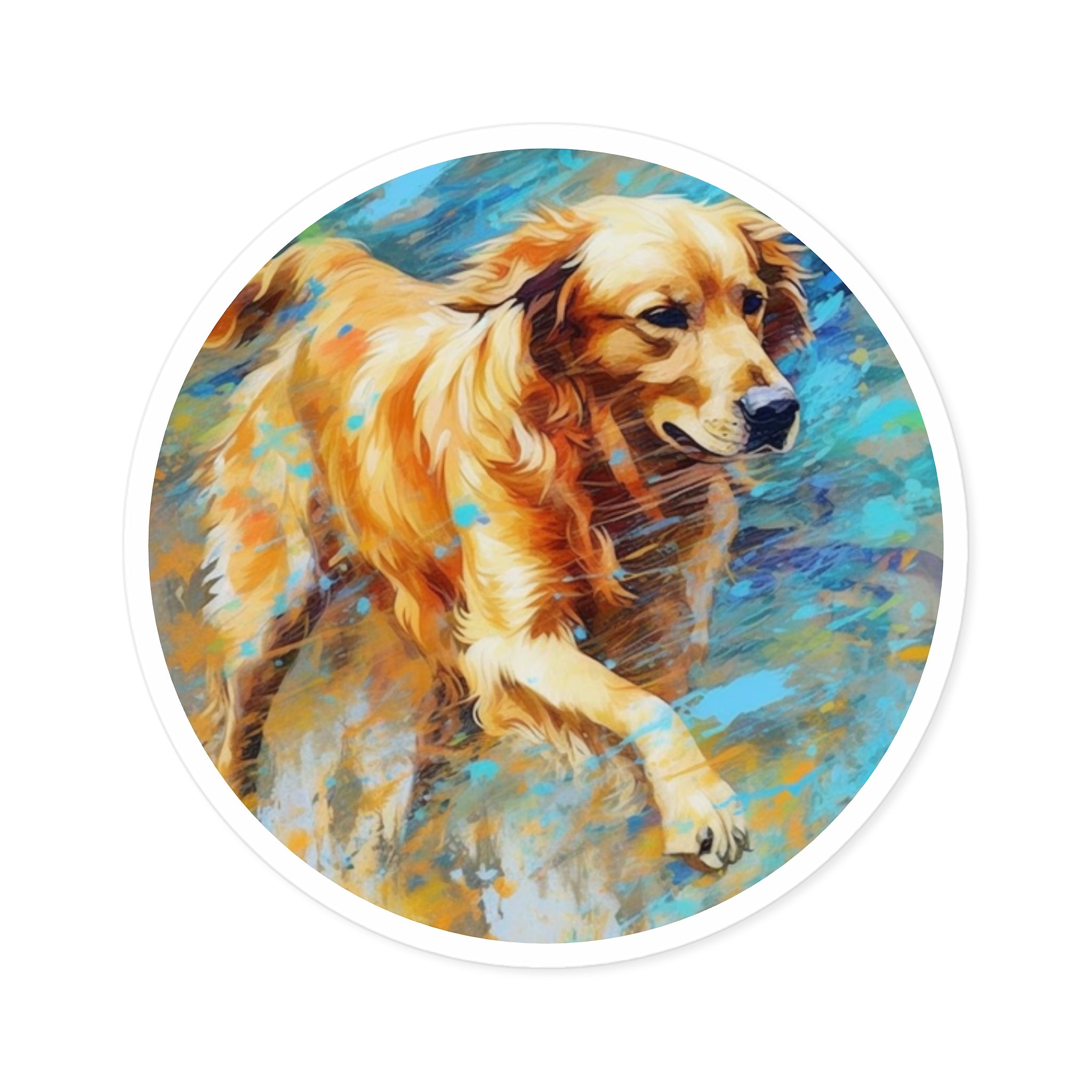 A golden retriever in motion surrounded by vivid splashes of color—expressive, dynamic, and full of energy.Product Features:-Material: Premium Vinyl-Available in 5 sizes-Finish: Matte-Water and scratch...