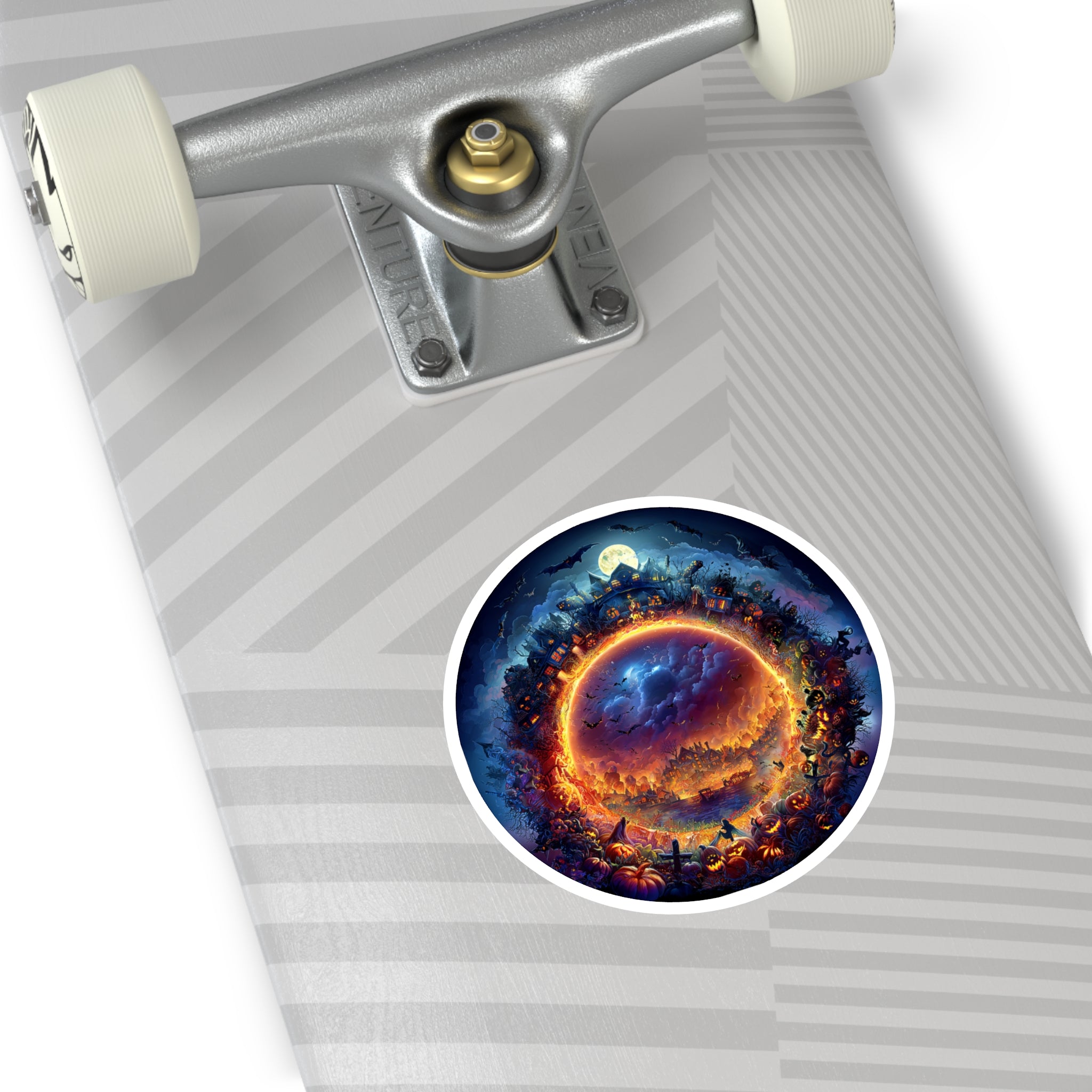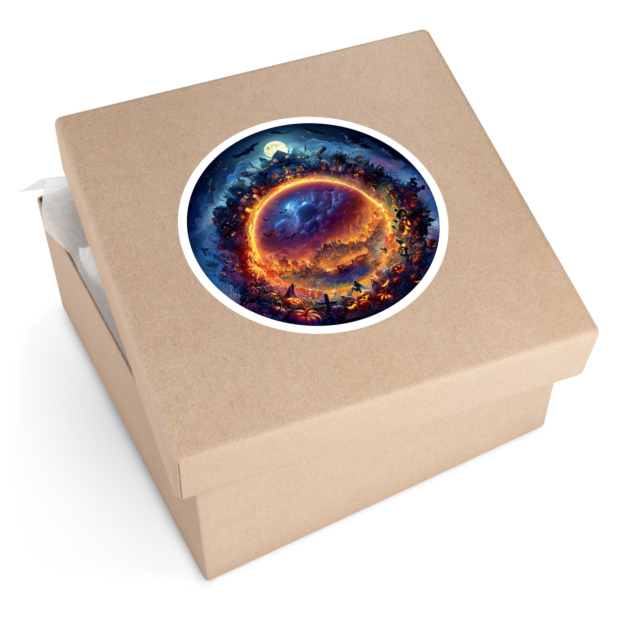 A circular Halloween-themed artwork featuring a lively village, pumpkins, bats, and atmospheric night elements. A detailed design perfect for seasonal fun.Product Features:-Material: Premium Vinyl-Available in...